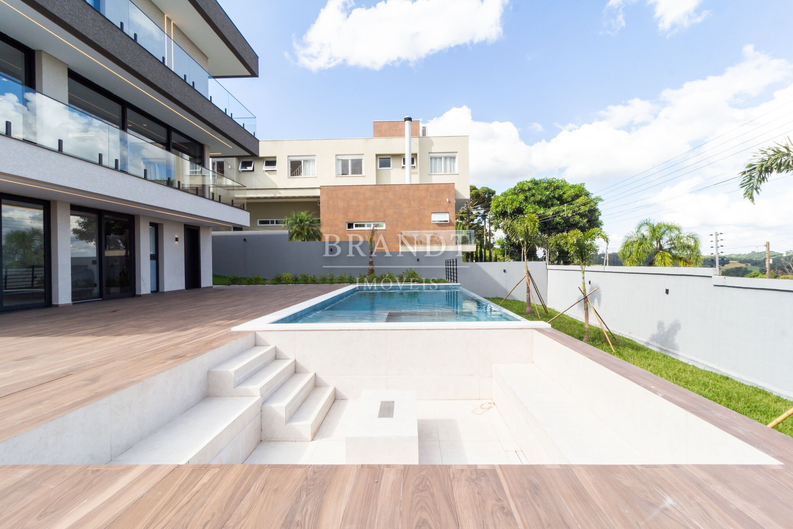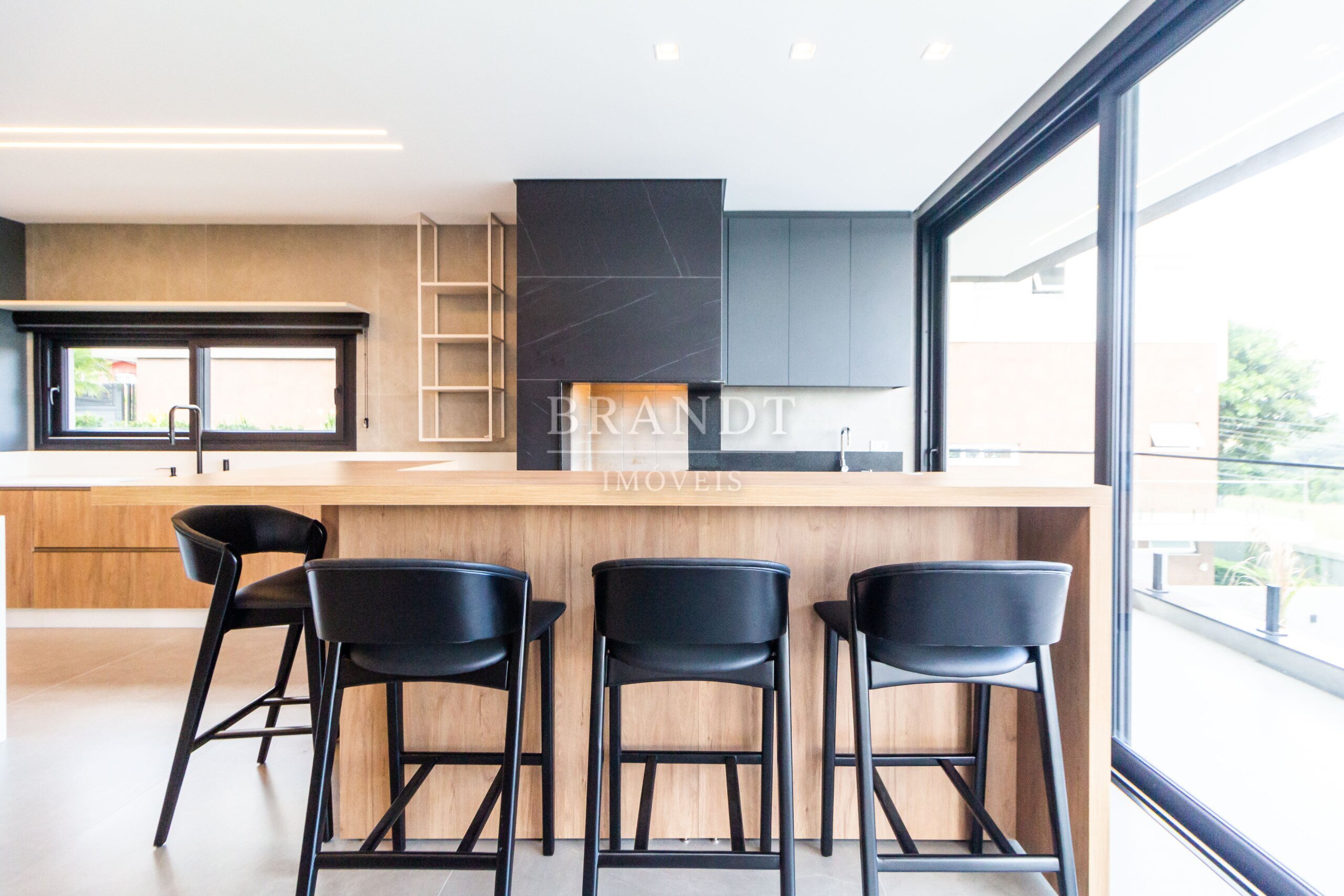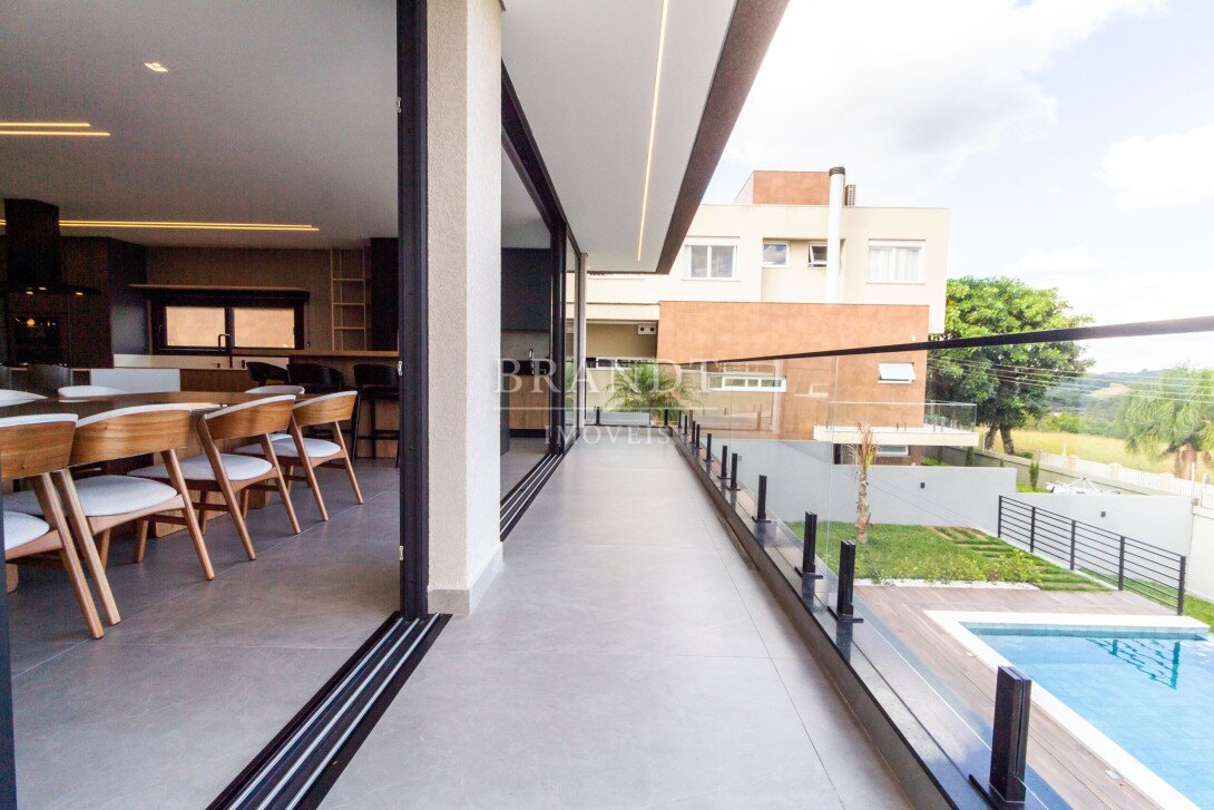 Espaço gourmet com churrasqueira, integrado à piscina e à área externa;