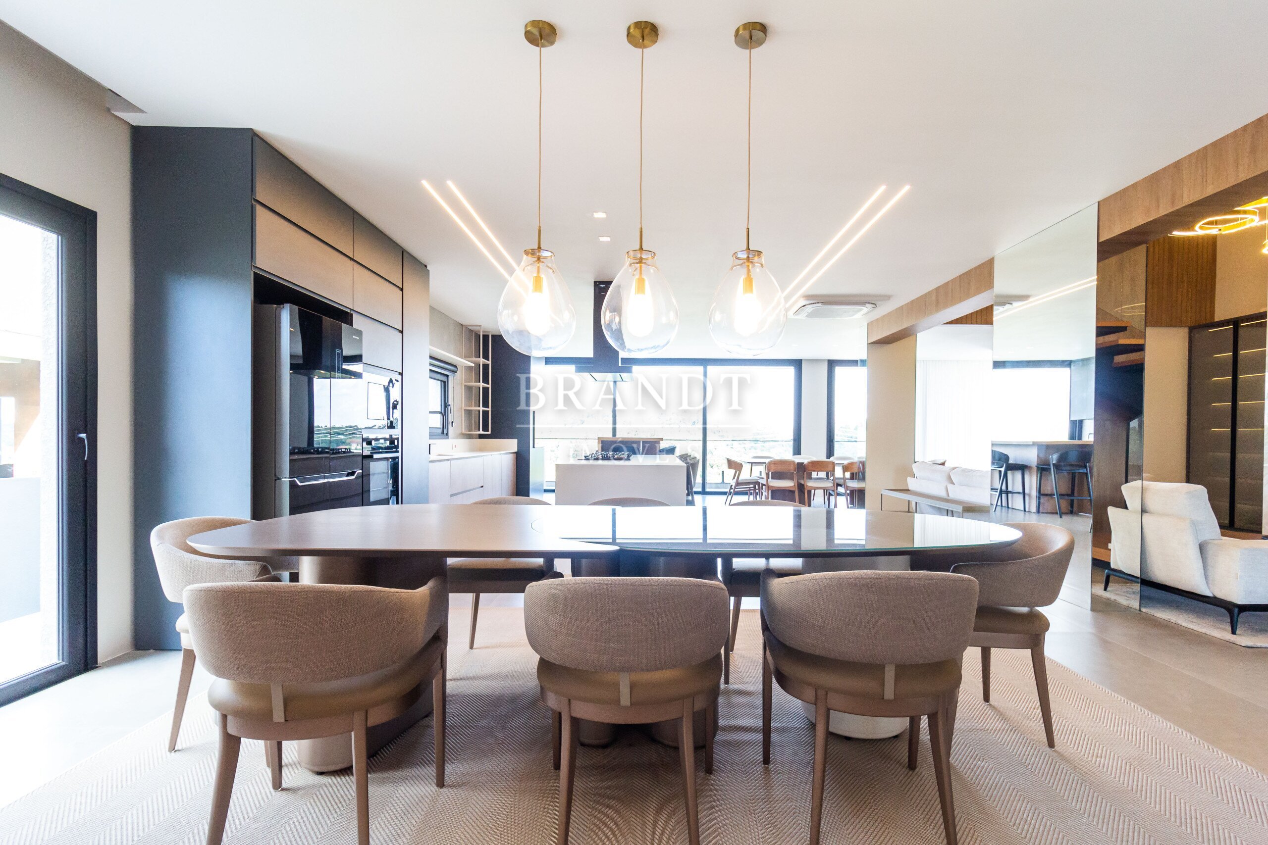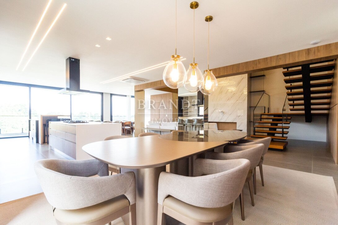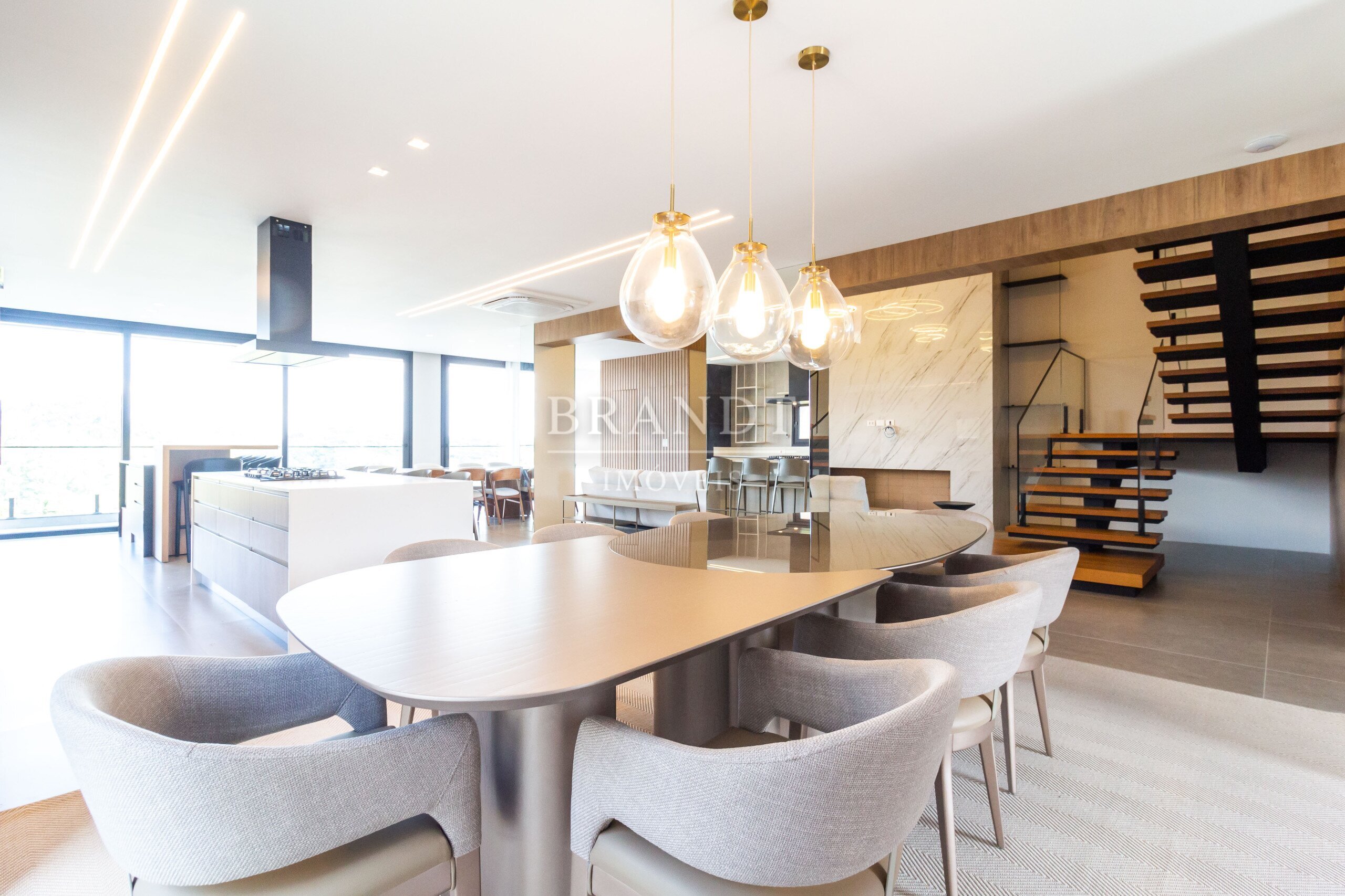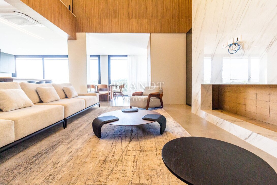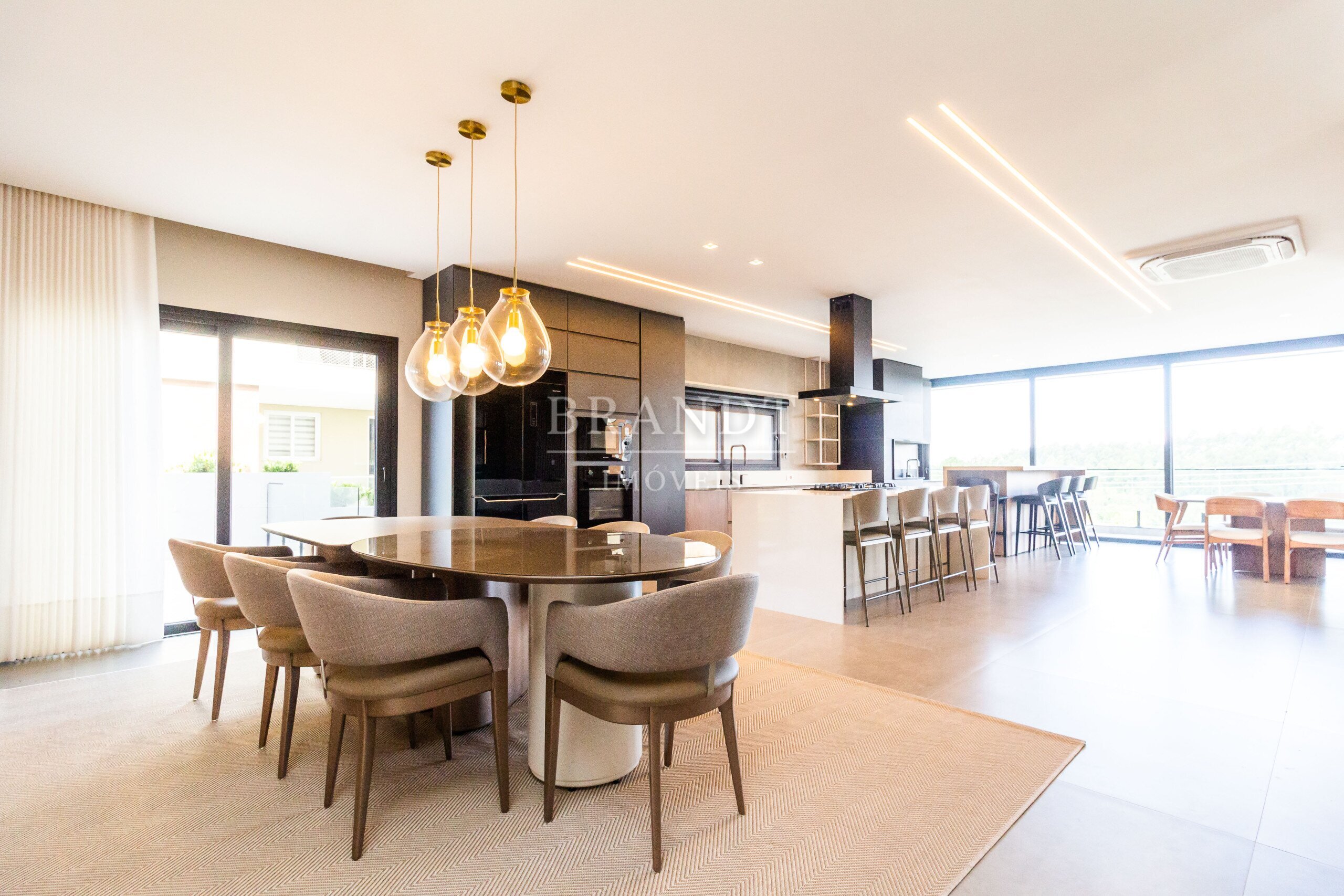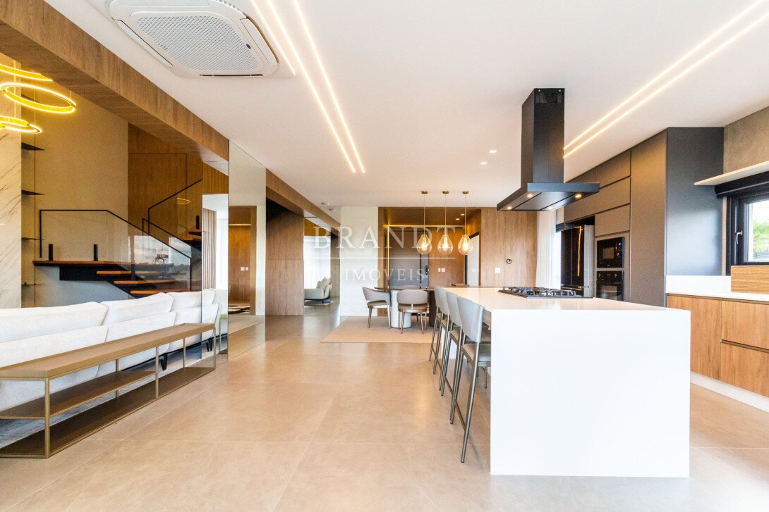 Sala de estar, jantar e cozinha em conceito aberto, com ar-condicionado de 48.000 BTUs;