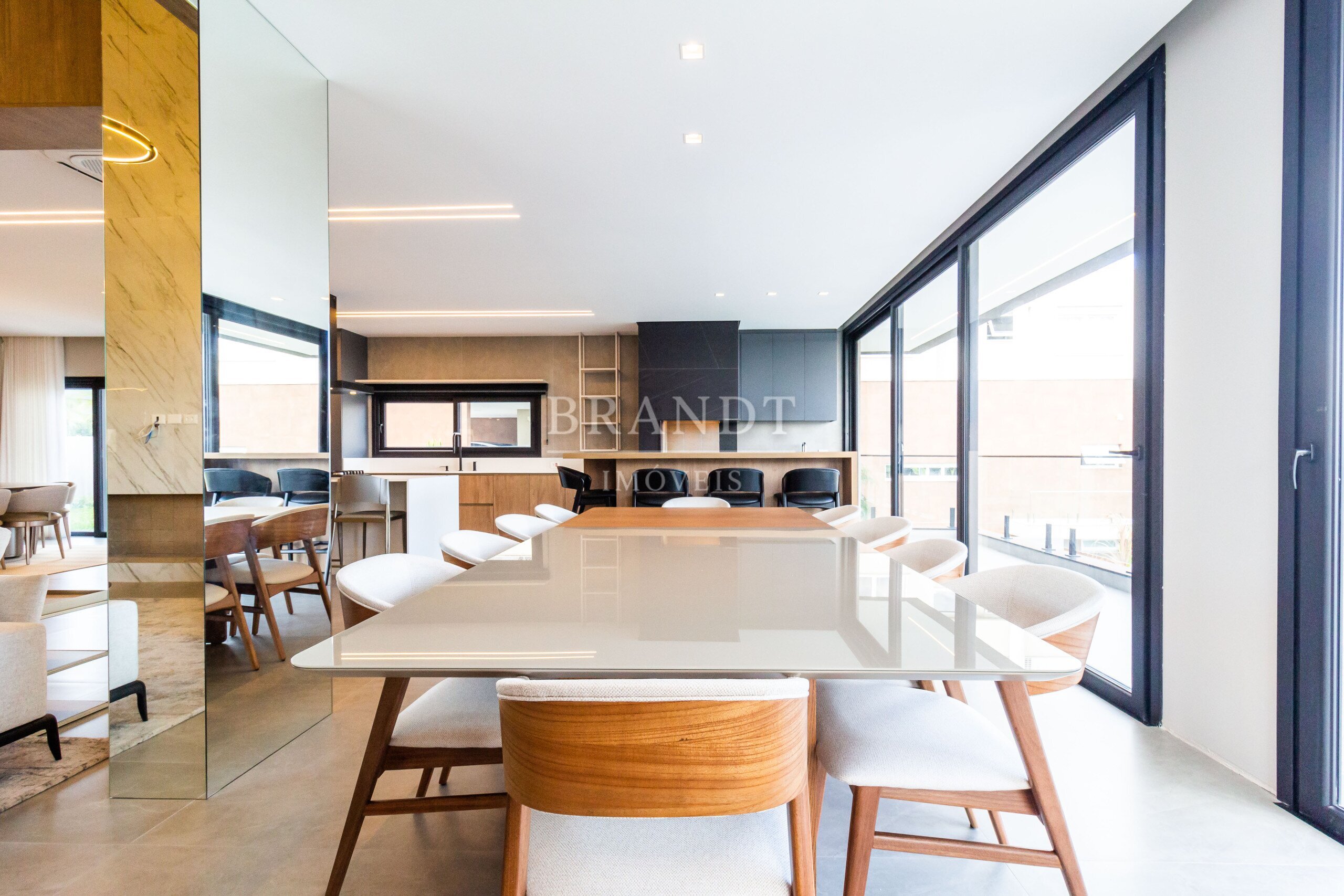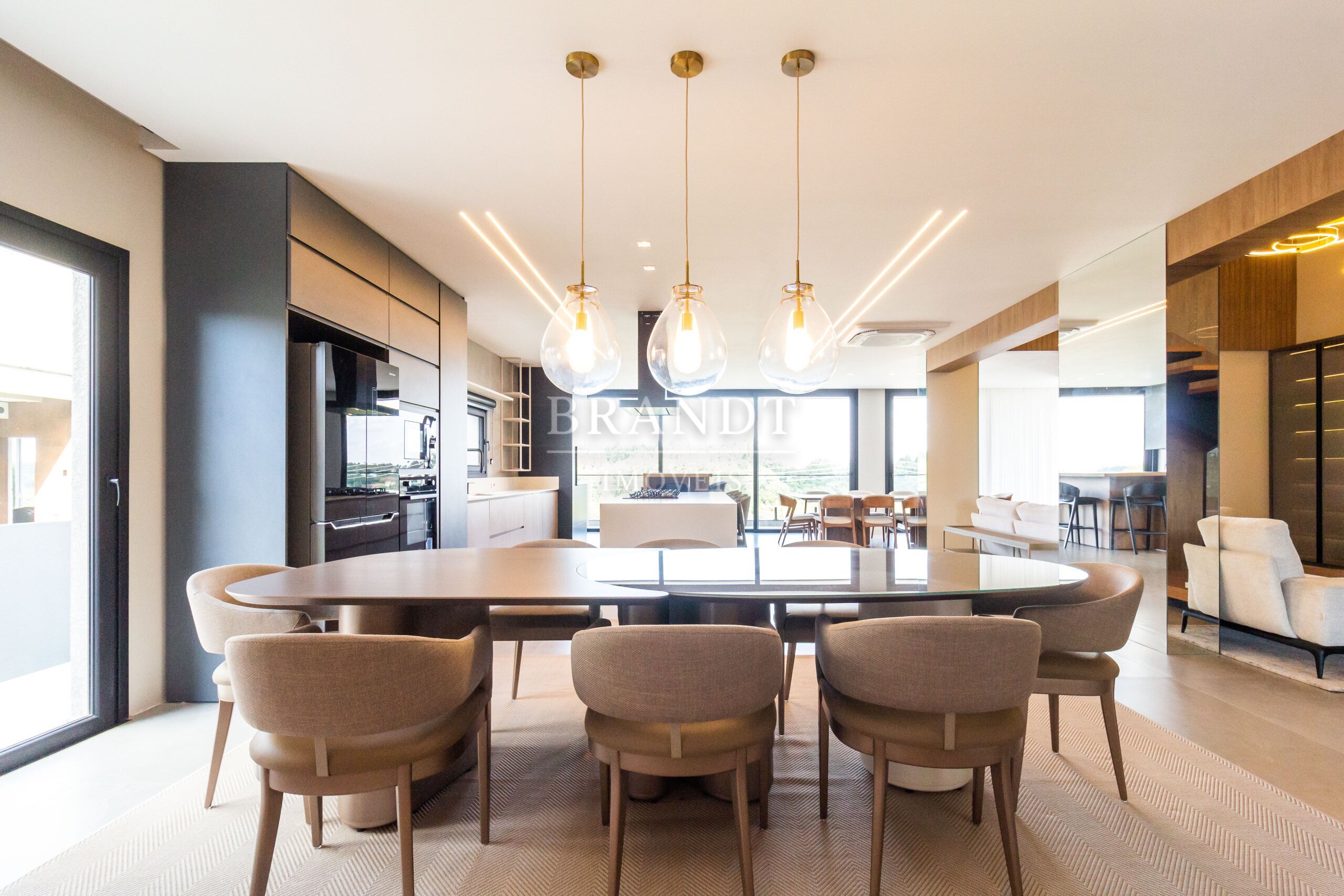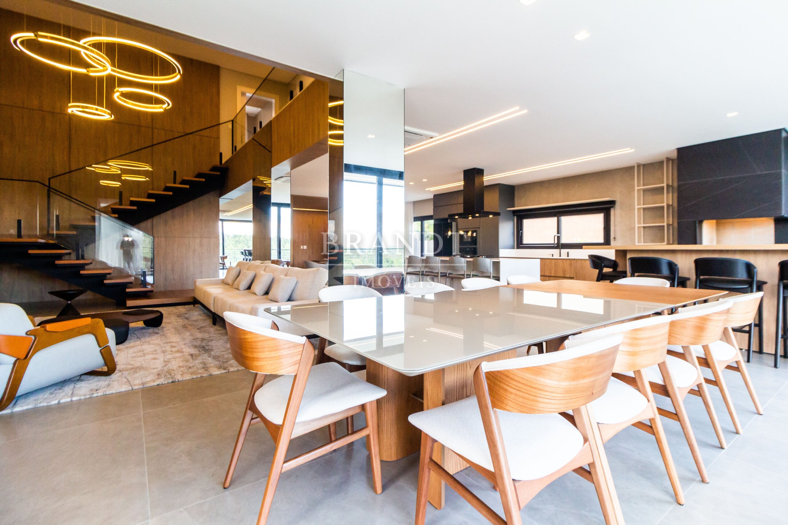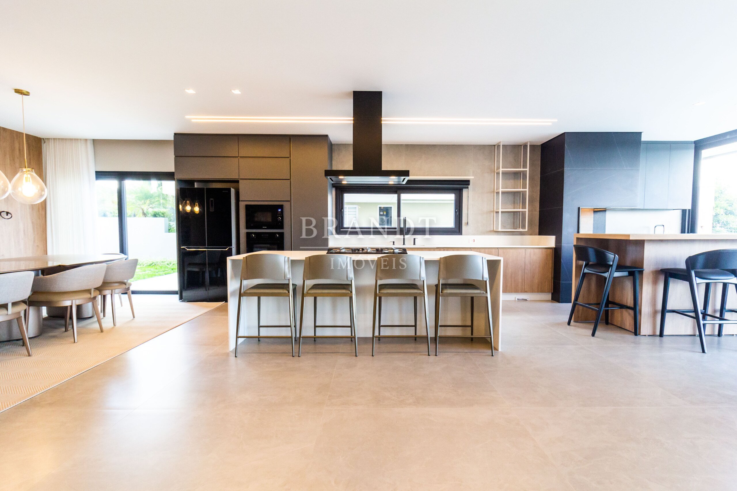 Sala de estar, jantar e cozinha em conceito aberto, com ar-condicionado de 48.000 BTUs;