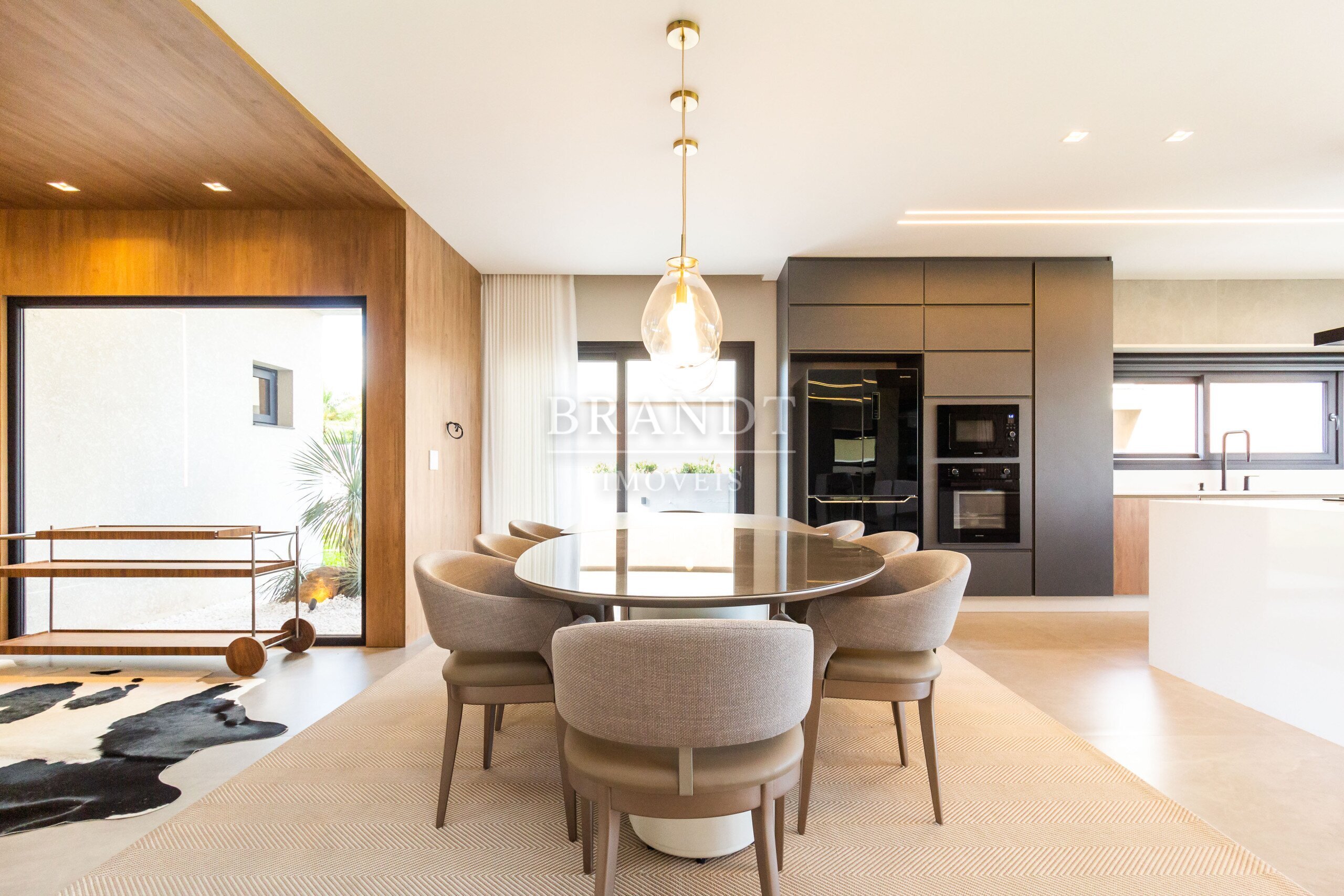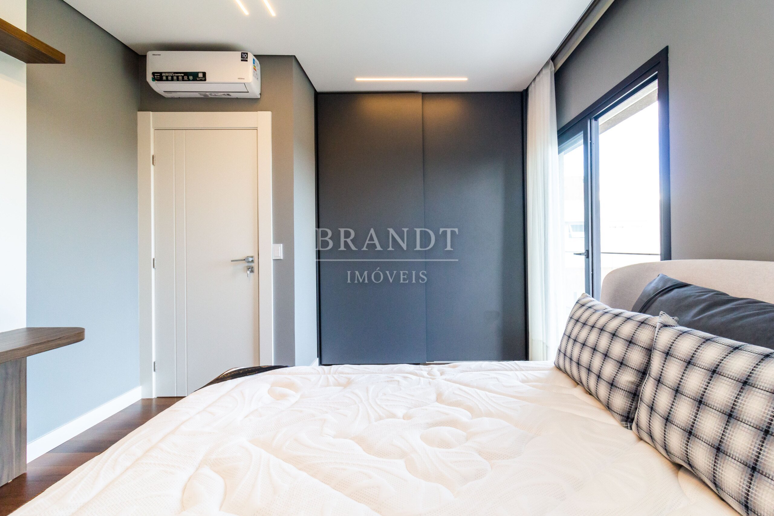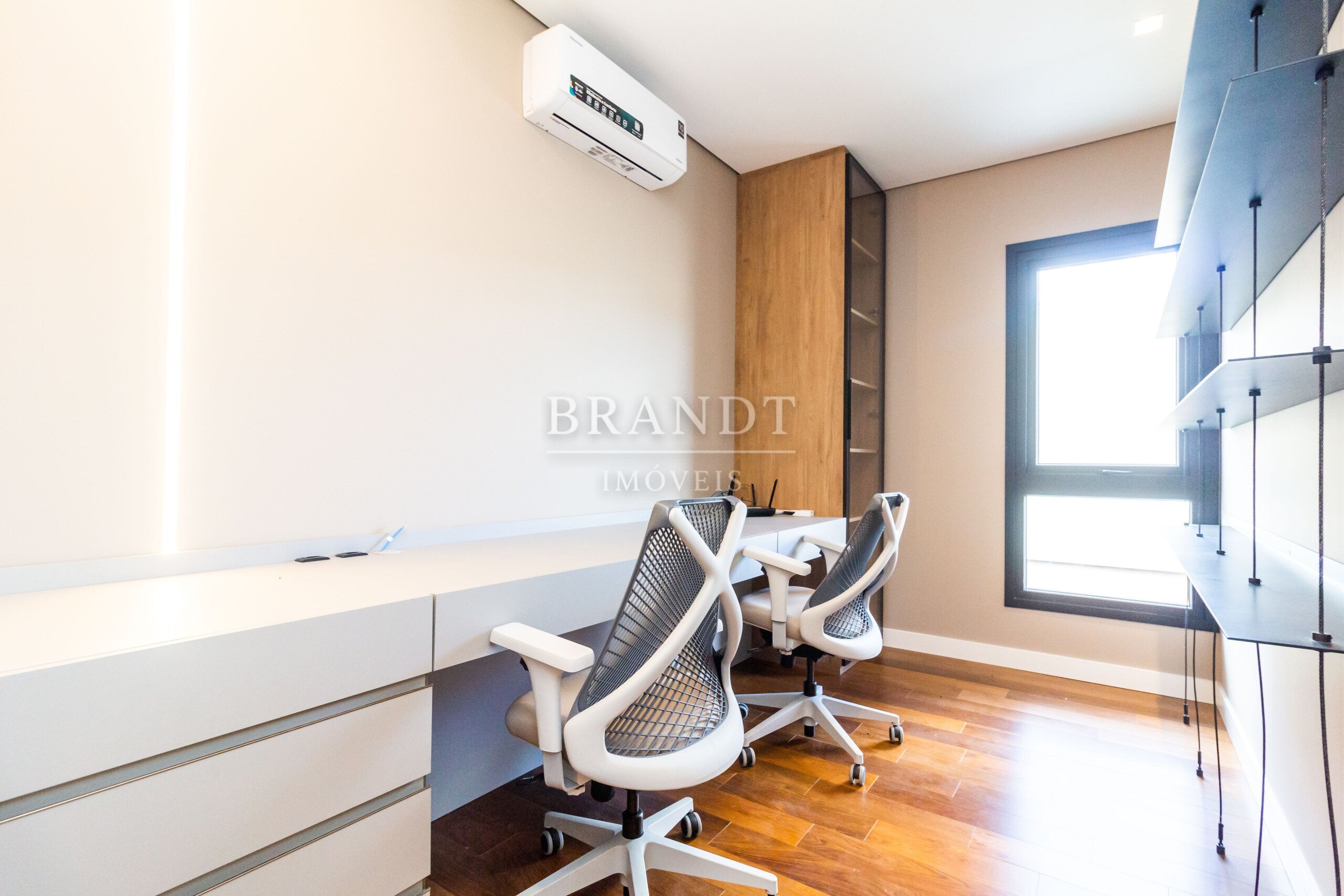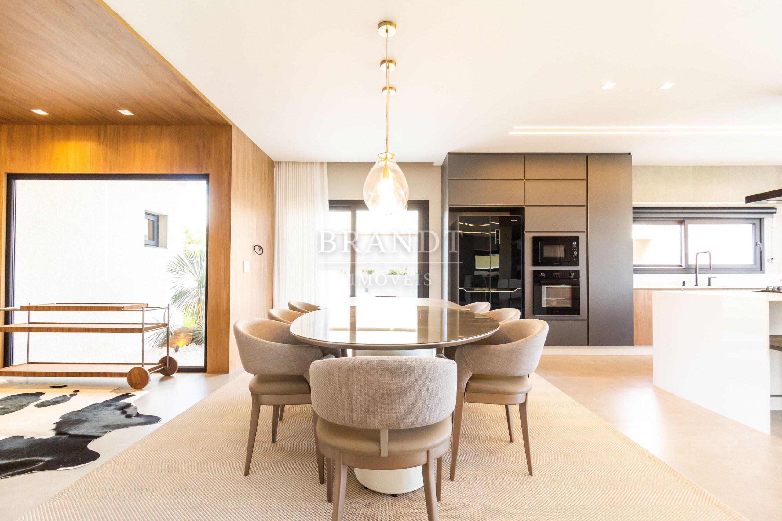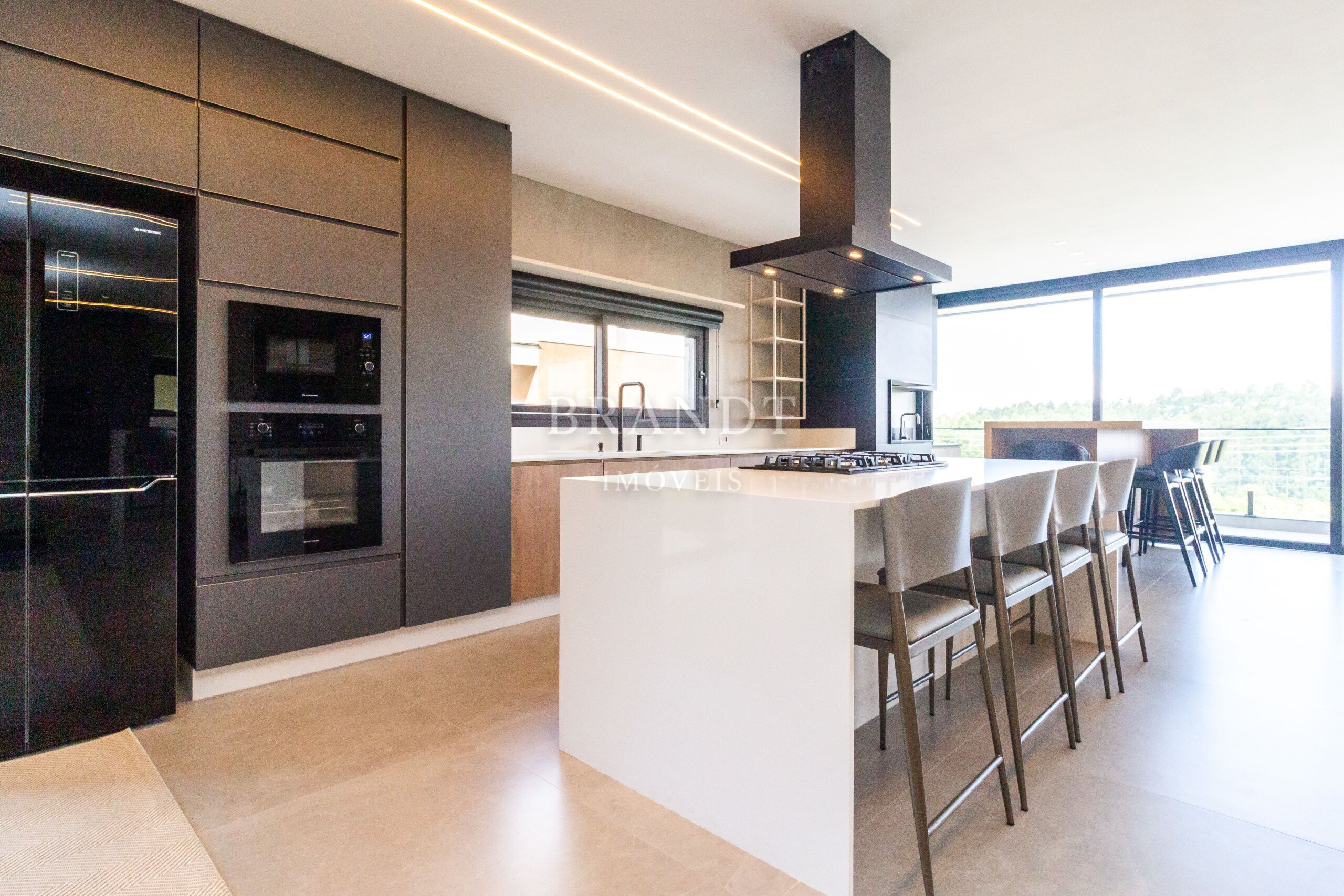 Sala de estar, jantar e cozinha em conceito aberto, com ar-condicionado de 48.000 BTUs;