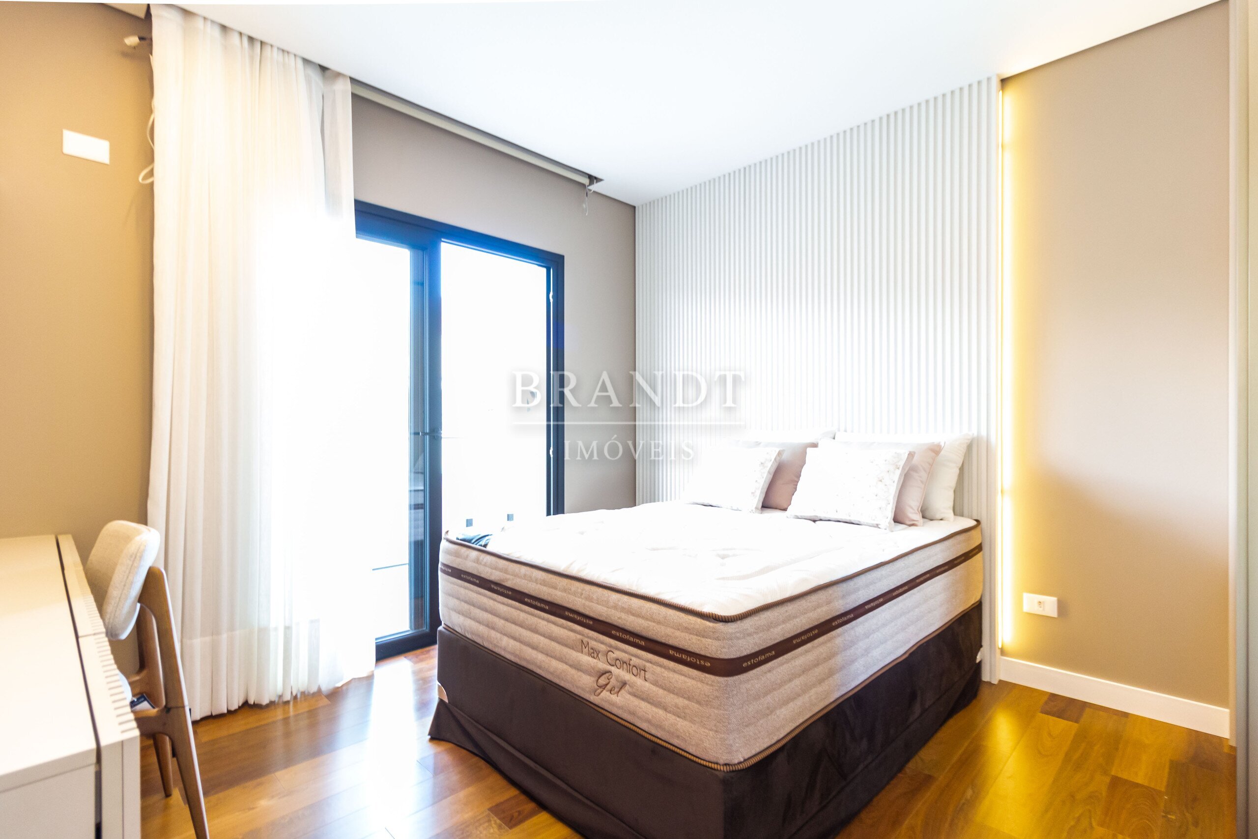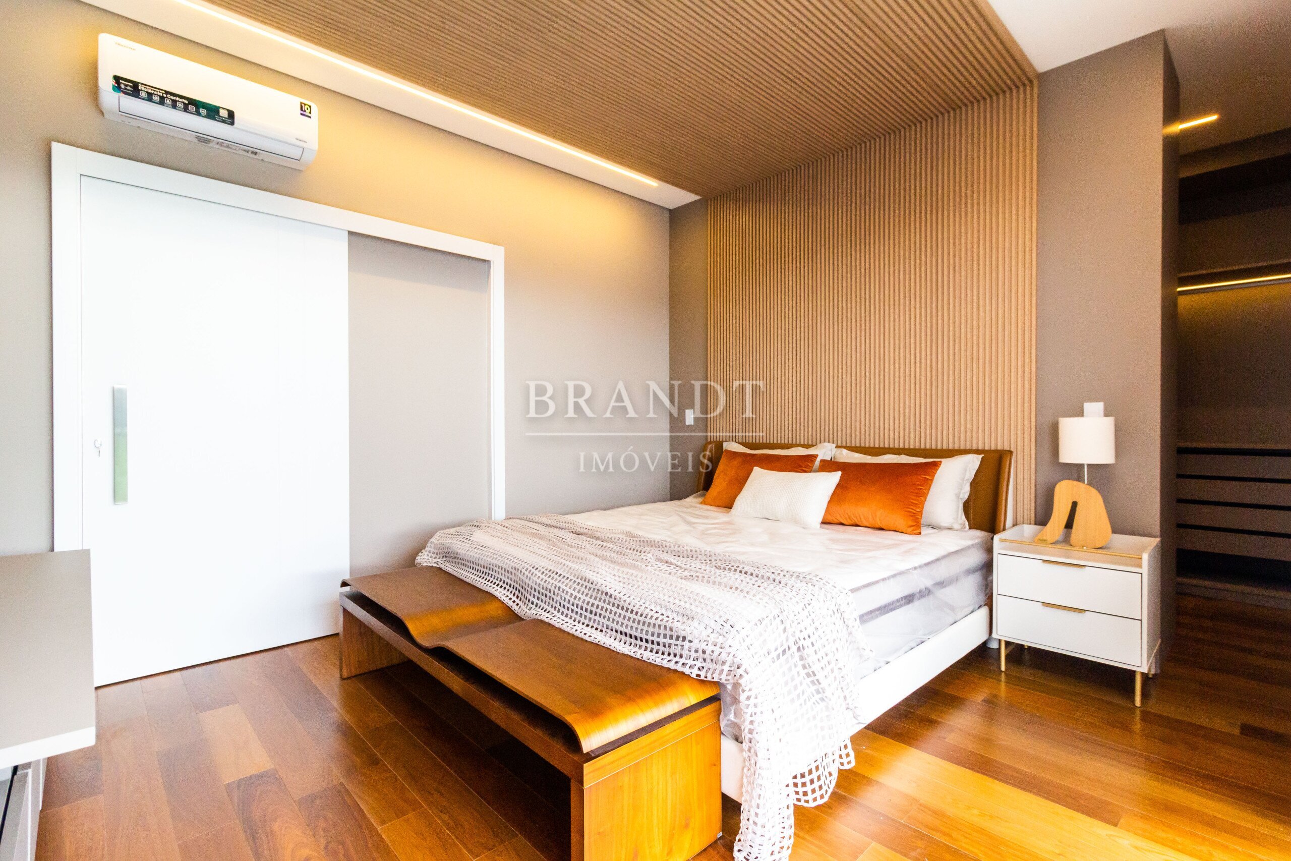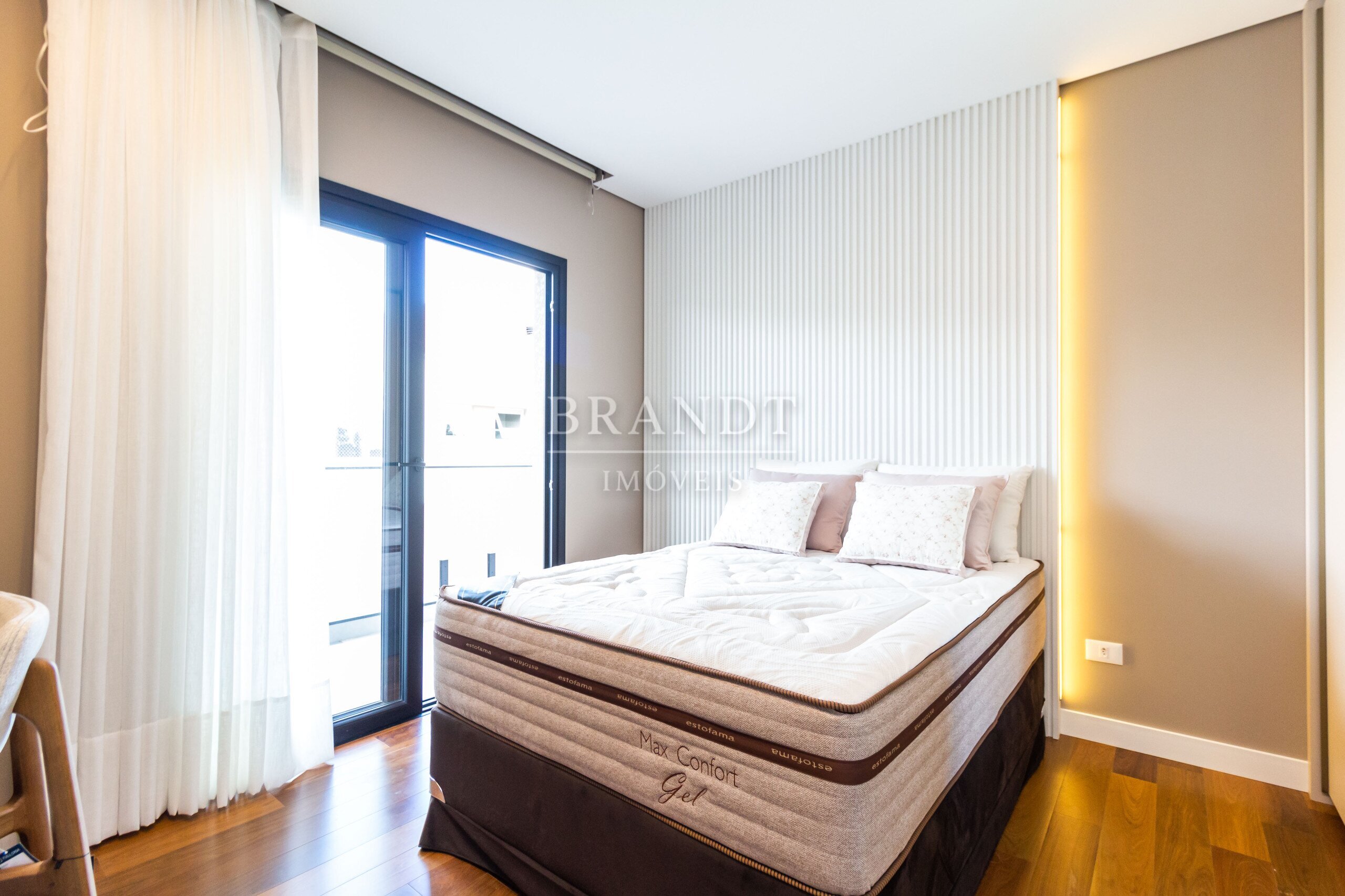 Piso de madeira maciça nos quartos, agregando elegância e conforto térmico;