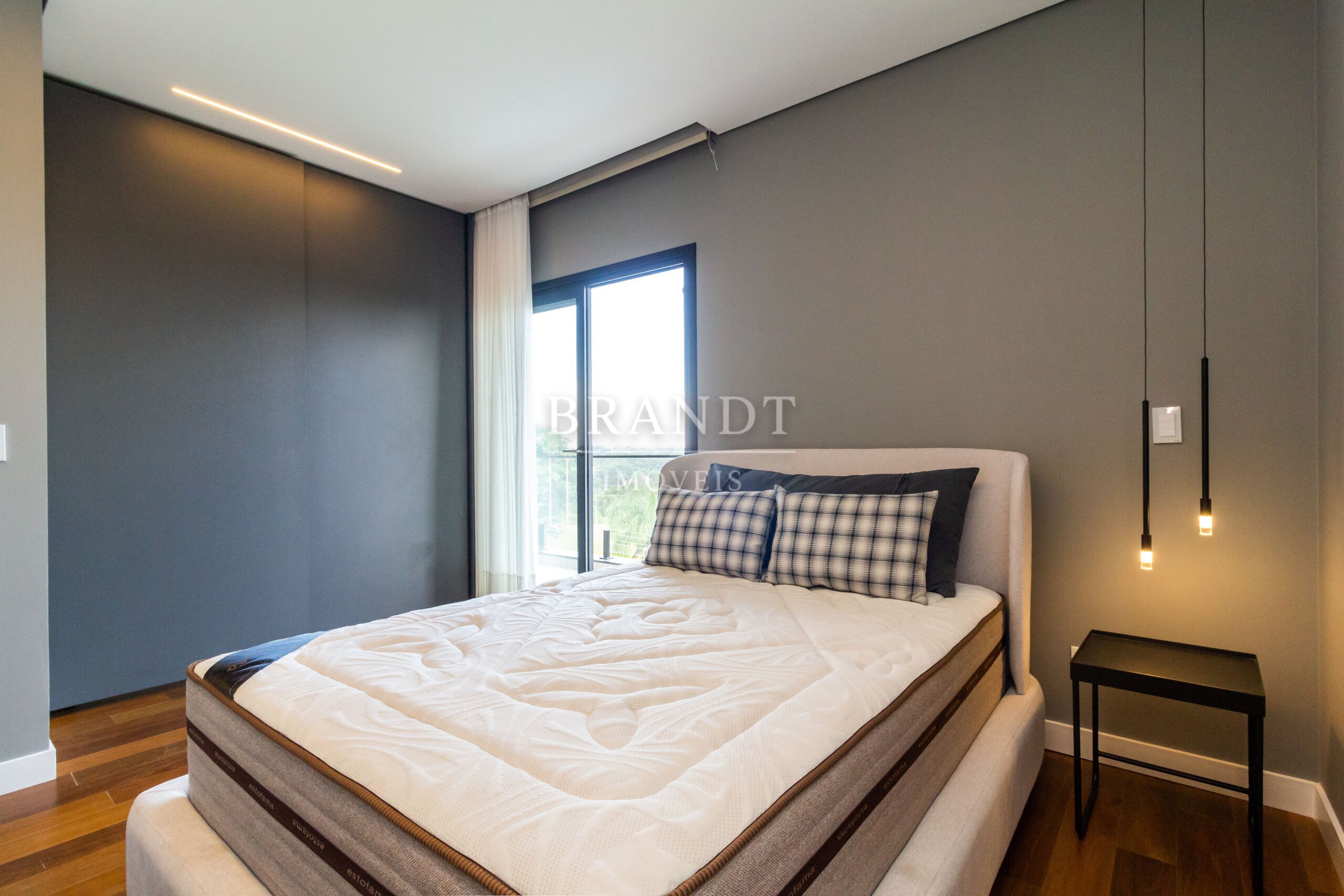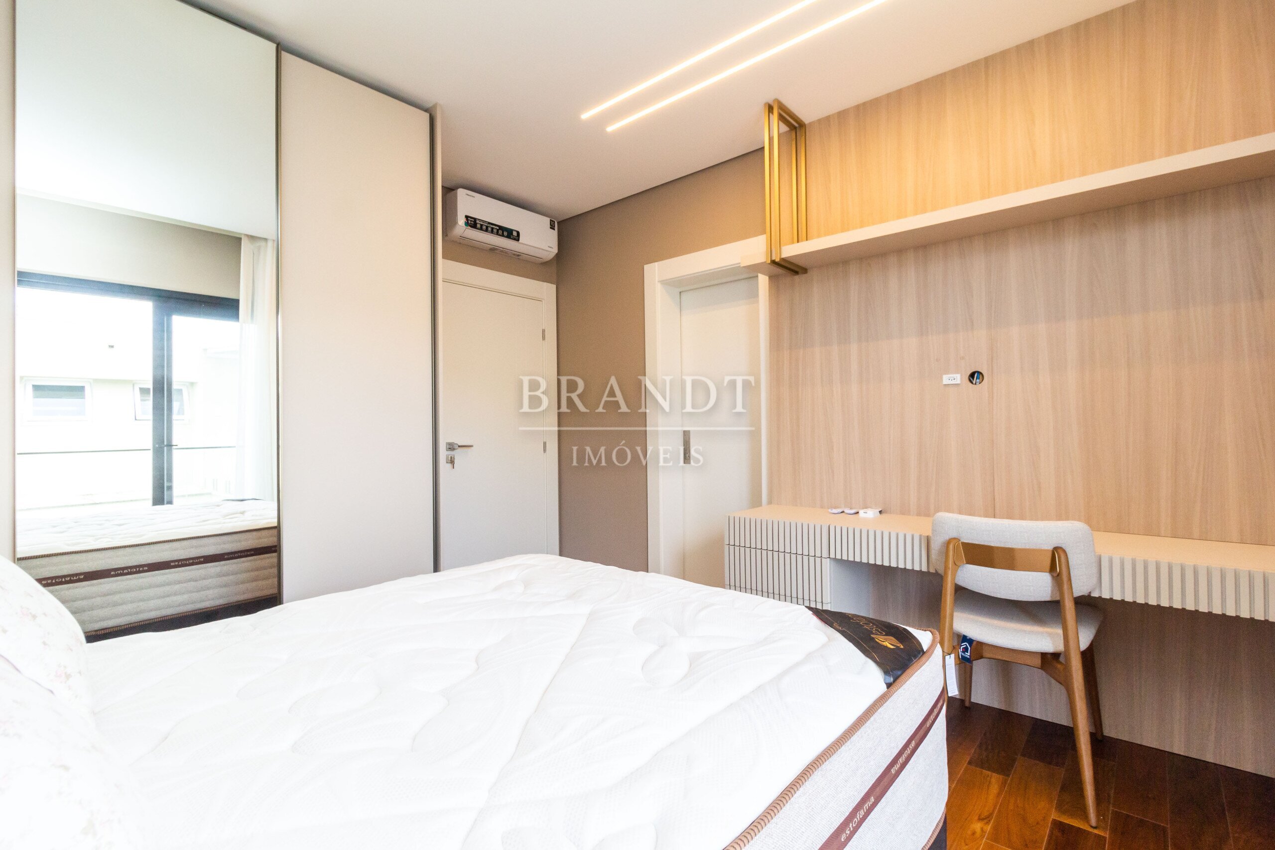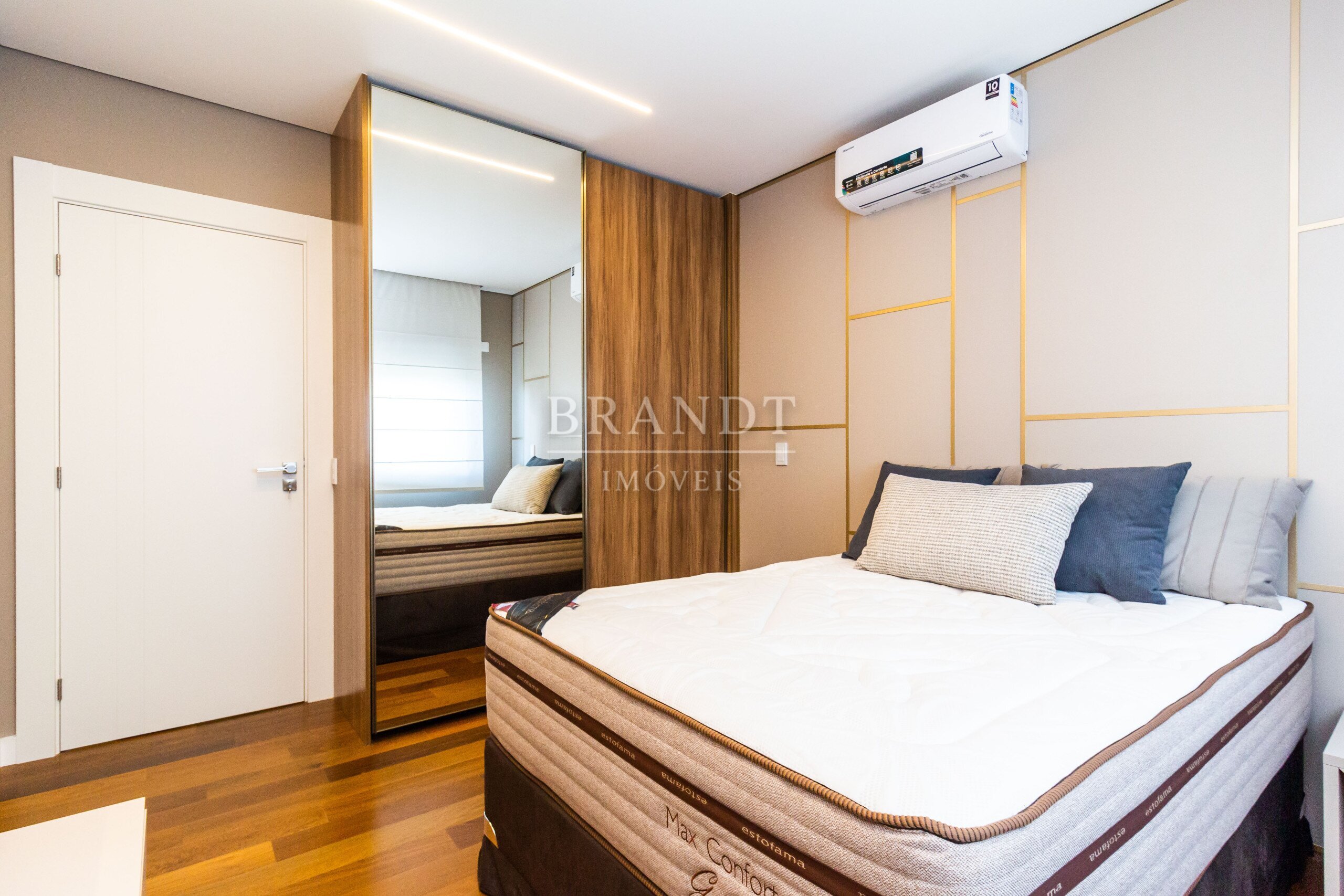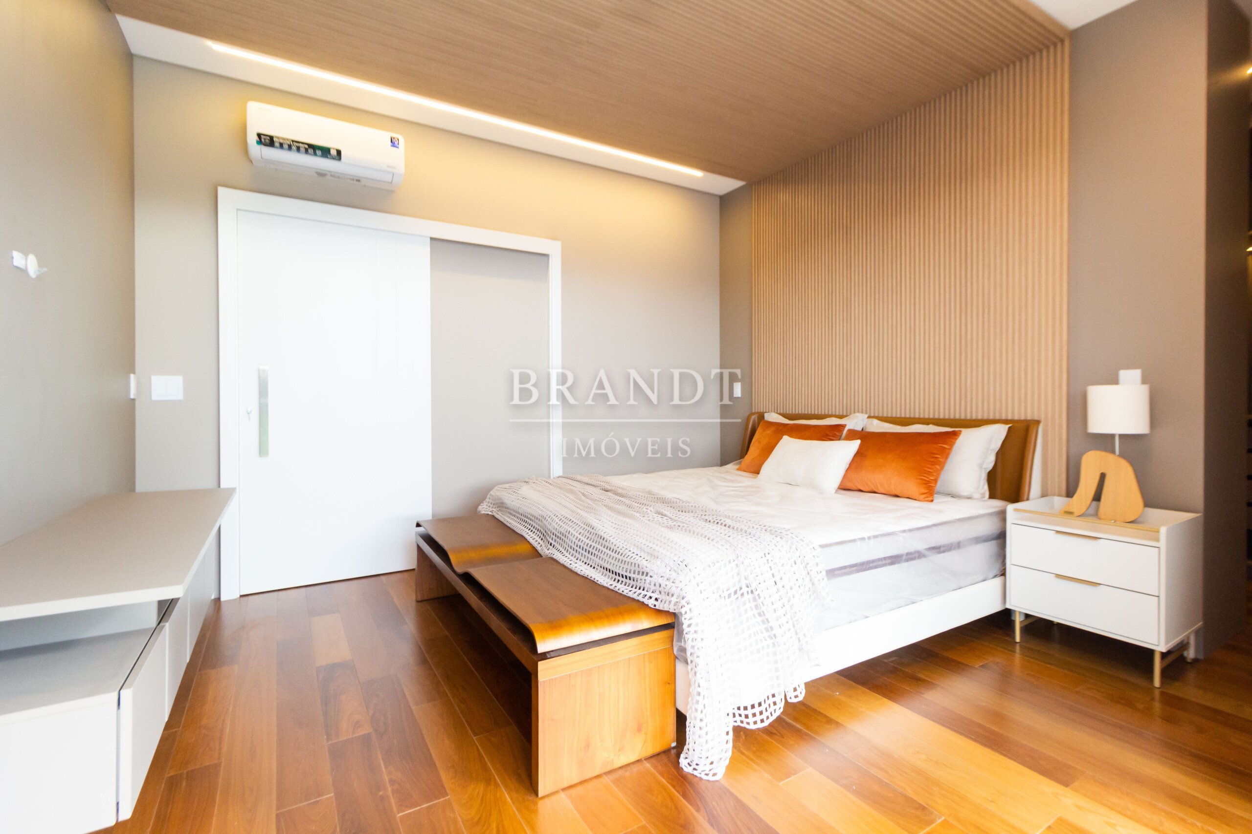 Piso de madeira maciça nos quartos, agregando elegância e conforto térmico;